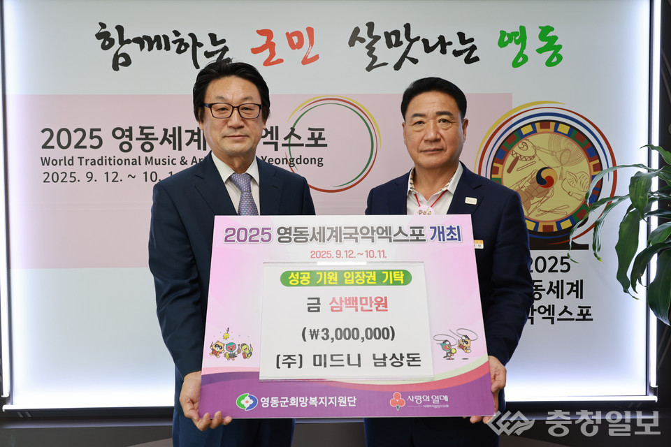 ㈜미드니가 30일 영동군청을 방문해 ‘2025 영동세계국악엑스포’의 성공 개최를 기원하며 입장권 구매 성금 300만원을 기탁했다. 원문 : https://www.ccdailynews.com/news/articleView.html?idxno=2340452